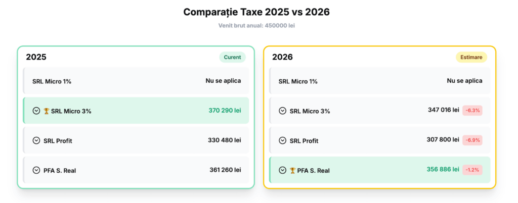 De exemplu, la un venit anual de 450.000 lei, pentru un SRL micro (3%), costul total cu taxele în 2026 este de aproximativ 103.000 lei, față de aproximativ 80.000 lei în 2025(costuri salariale pentru un angajat + impozit pe profit + impozit pe dividende + contribuții CASS). La un PFA, costul cu taxele și impozitele pentru aceeași sumă este de 93.114 lei în 2026, doar cu aprox. 4000 de lei mai mult decât în 2025 (din care 53.460 lei reprezintă contribuțiile sociale la sănătate și pensie, care nu vor depăși acest nivel, indiferent cât de mult va mai crește venitul încasat). La acest nivel de venit, cea mai convenabilă opțiune în 2025 ar fi fost un SRL micro, pe când în 2026 devine mai avantajos un PFA în sistem real.