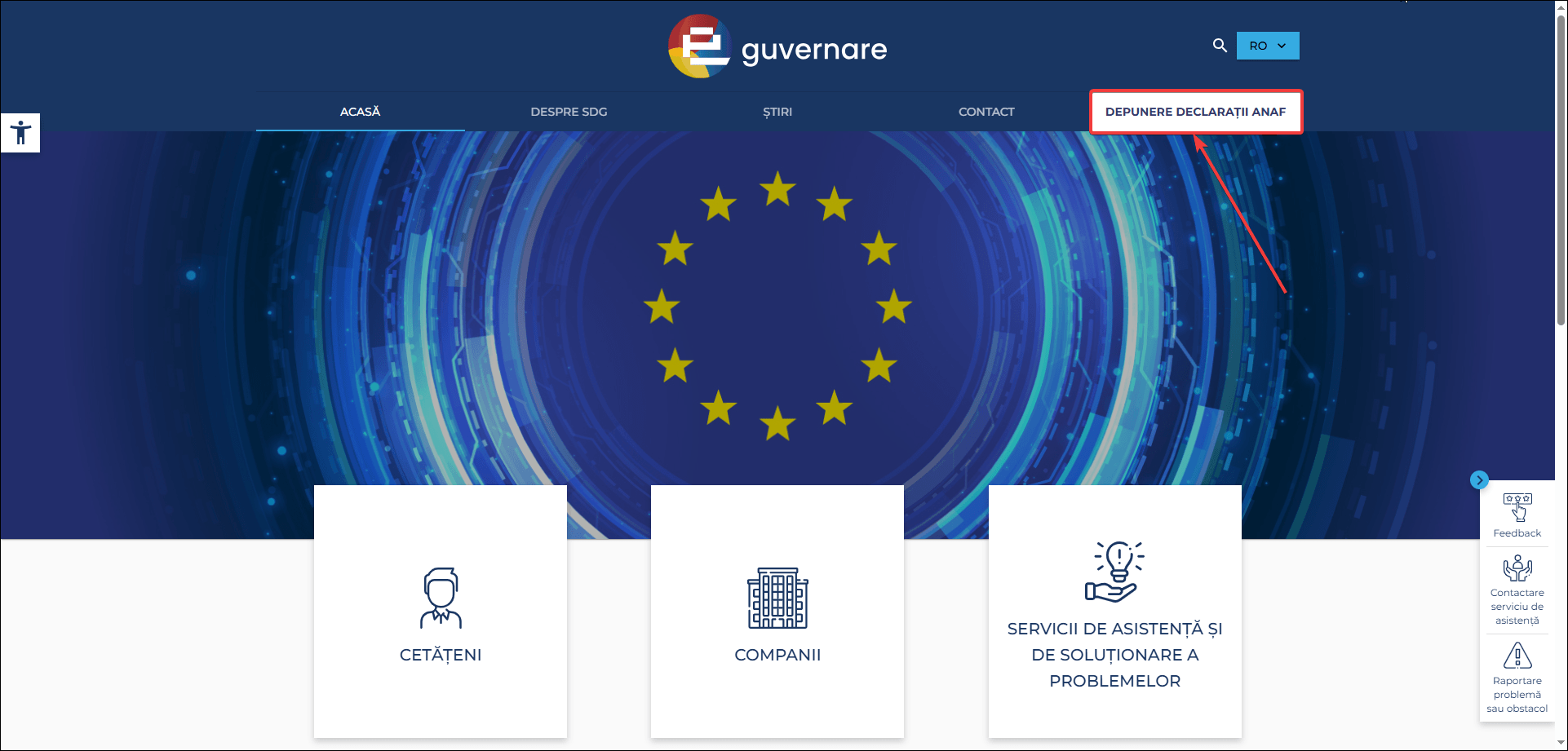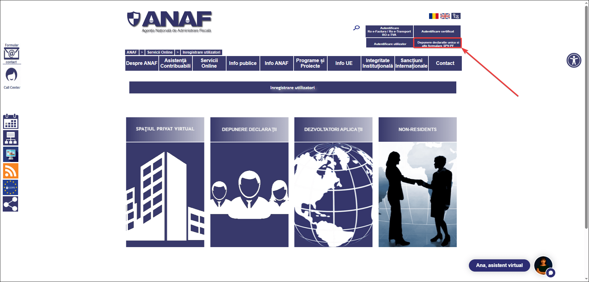 - Intră pe site-ul oficial e-guvernare.ro, la secțiunea Depunere declarații ANAF.