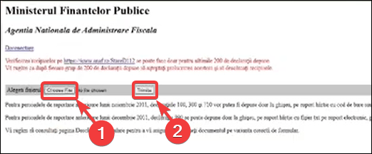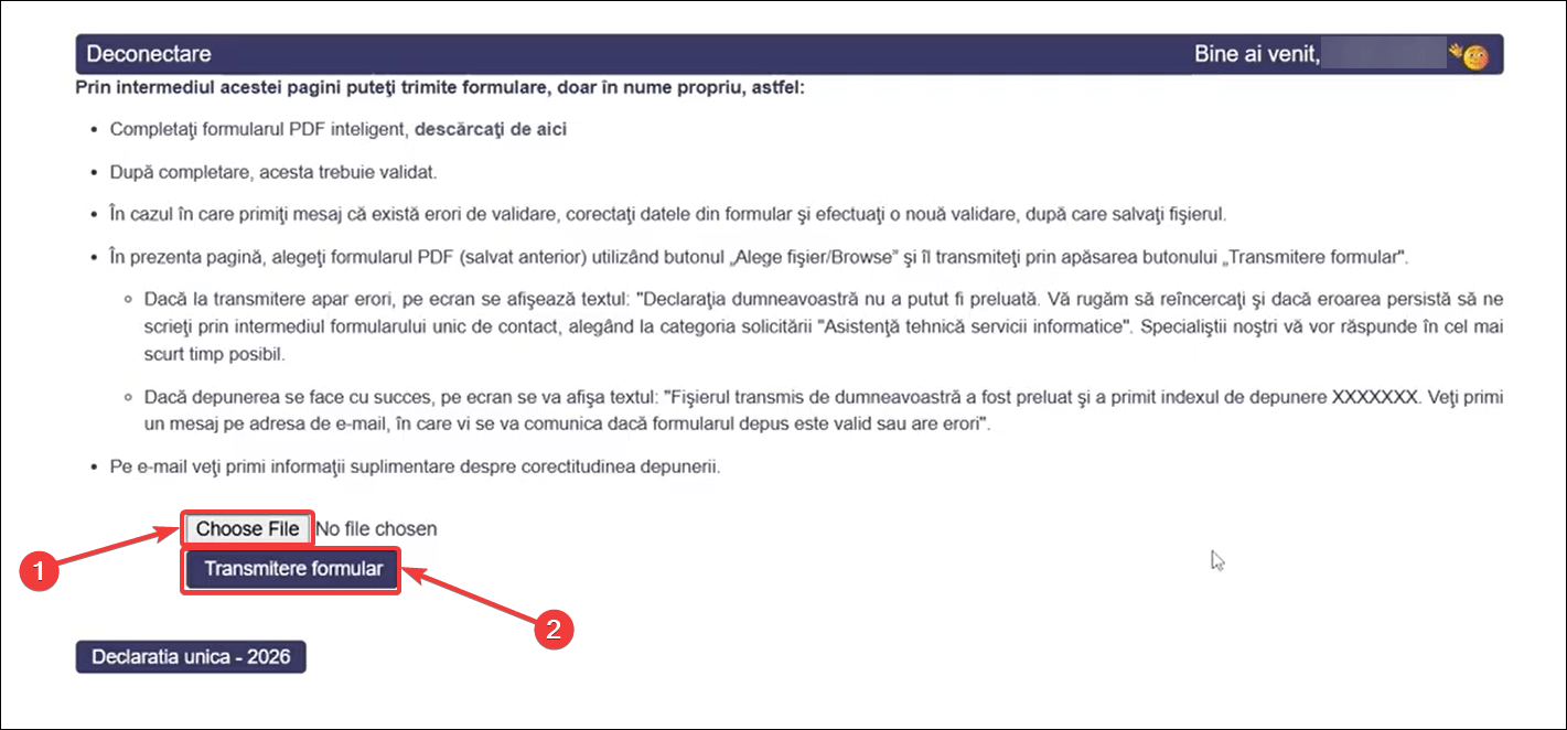 - Următorul pas este să dai click pe butonul Choose File și să încarci Declarația unică (PDF) de pe dispozitivul tău. După aceea, apasă pe butonul Transmitere formular.