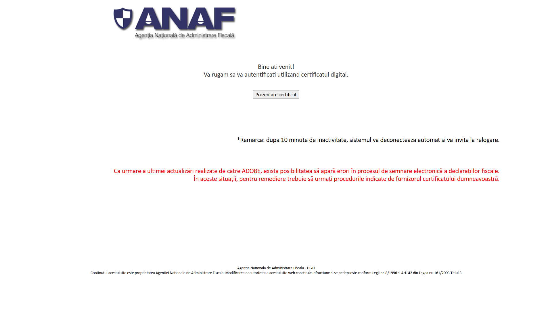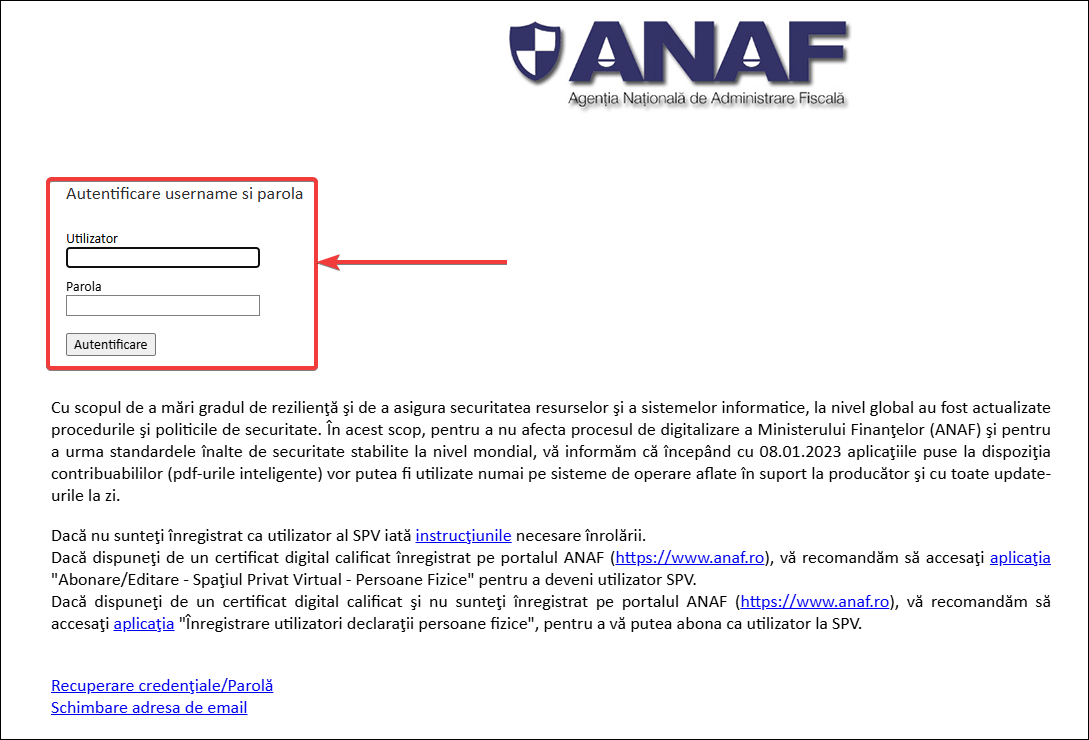 - Dacă ai deja cont, autentifică-te. Dacă nu ai cont, poți crea unul nou doar cu user și parolă (fără semnătură electronică), cu ajutorul acestui ghid. Va trebui să completezi un formular cu datele tale personale, iar mai apoi, după ce ai un cont activ, să te autentifici.