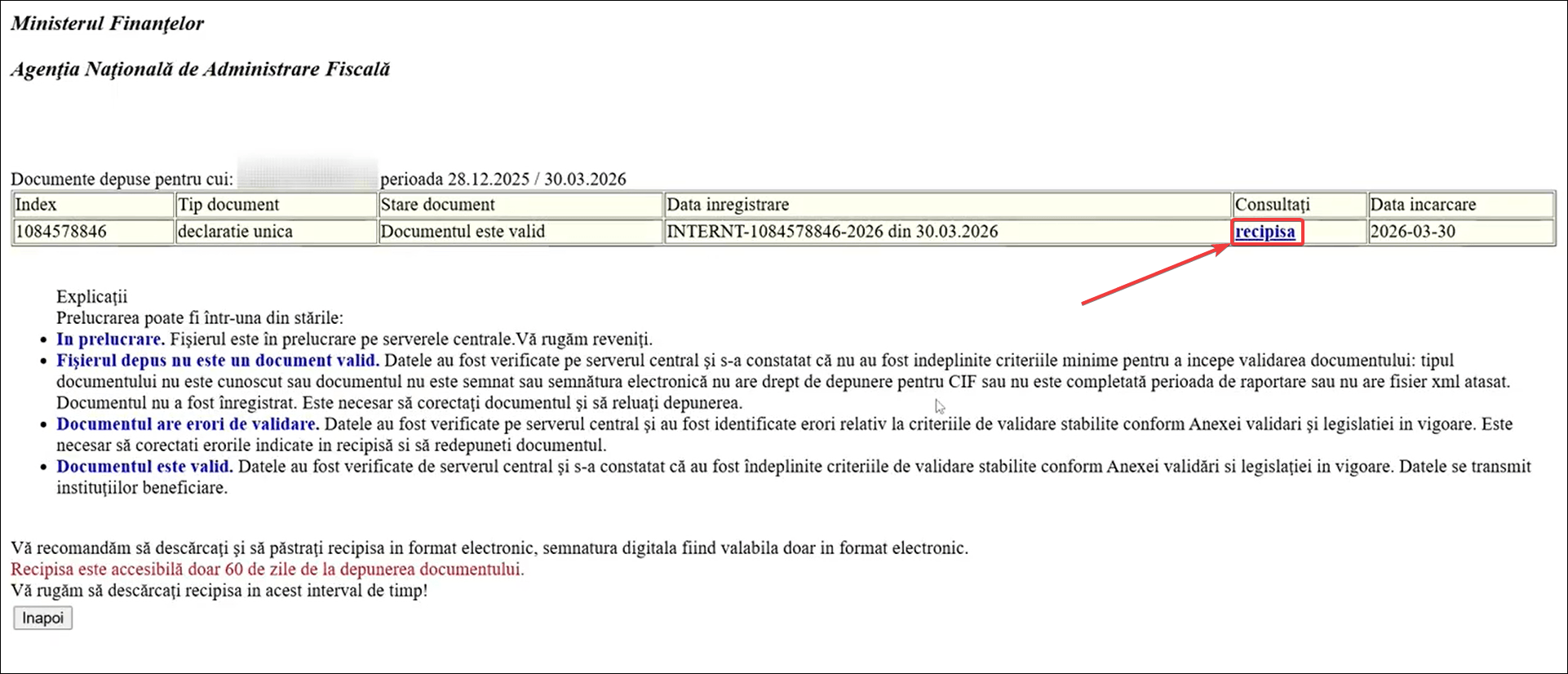 - Vei fi redirecționat către o nouă pagină unde poți vedea starea documentului. În partea dreaptă a tabelului, dă click pe recipisă pentru a o descărca.