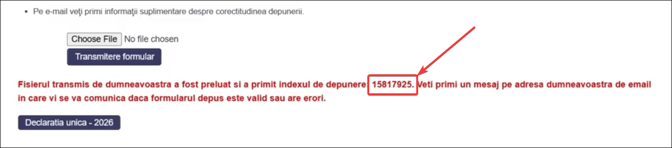 - Vei vedea un mesaj de confirmare care arată că fișierul încărcat de tine a fost preluat, iar în acest mesaj vei găsi și indexul de depunere.