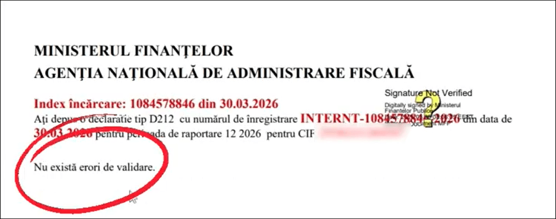 - După ce ai descărcat-o, verifică recipisa. Dacă primești mesajul Nu există erori de validare, înseamnă că ai depus Declarația cu succes.