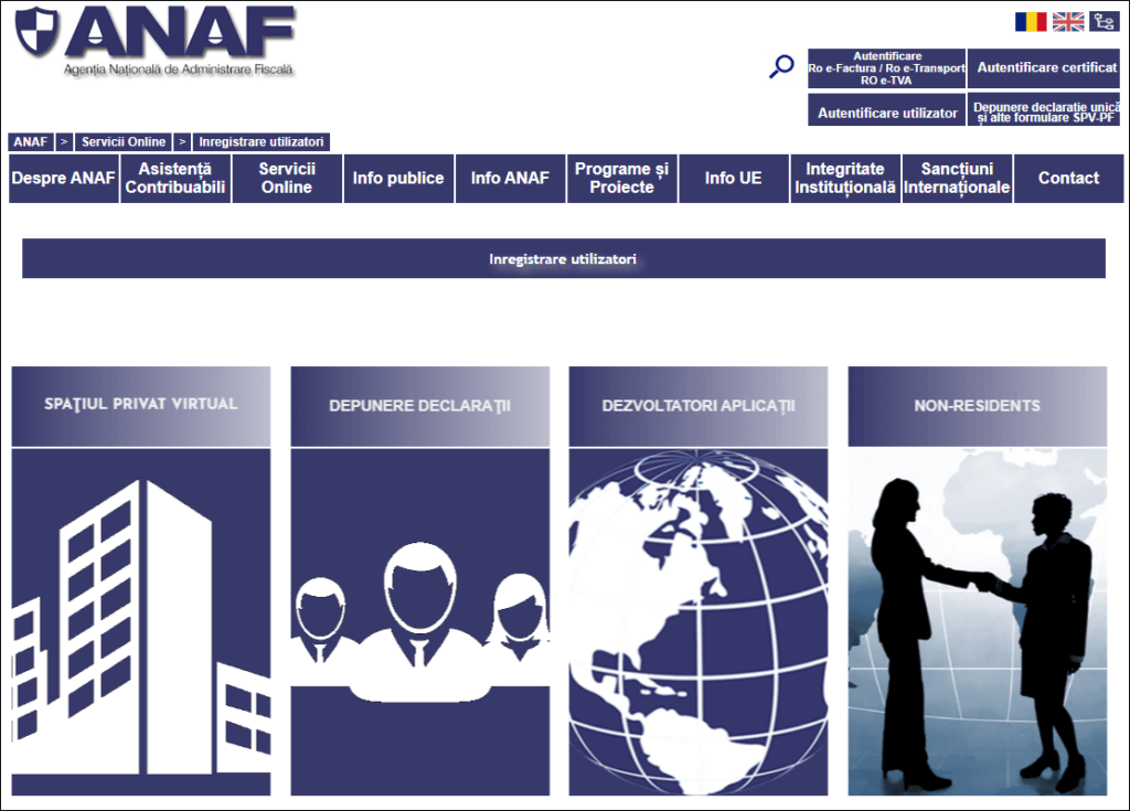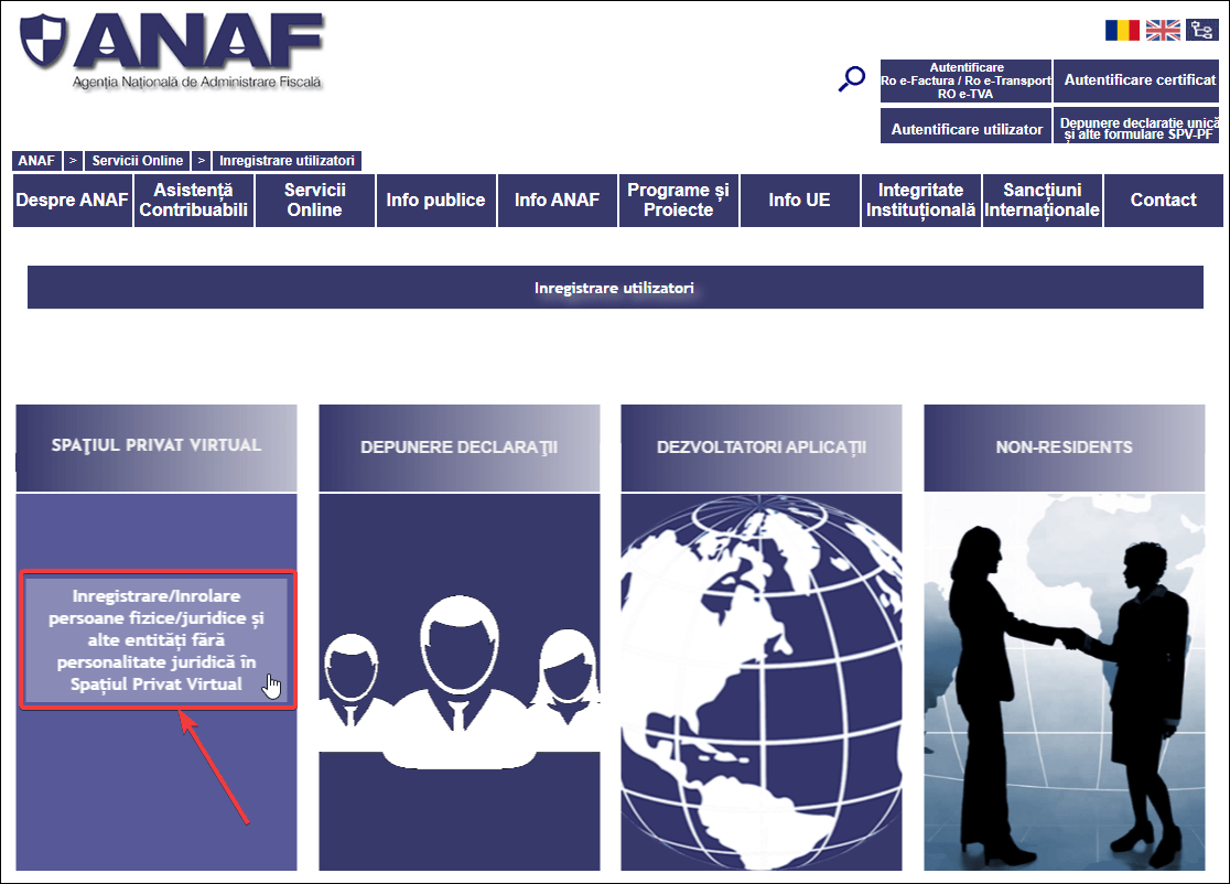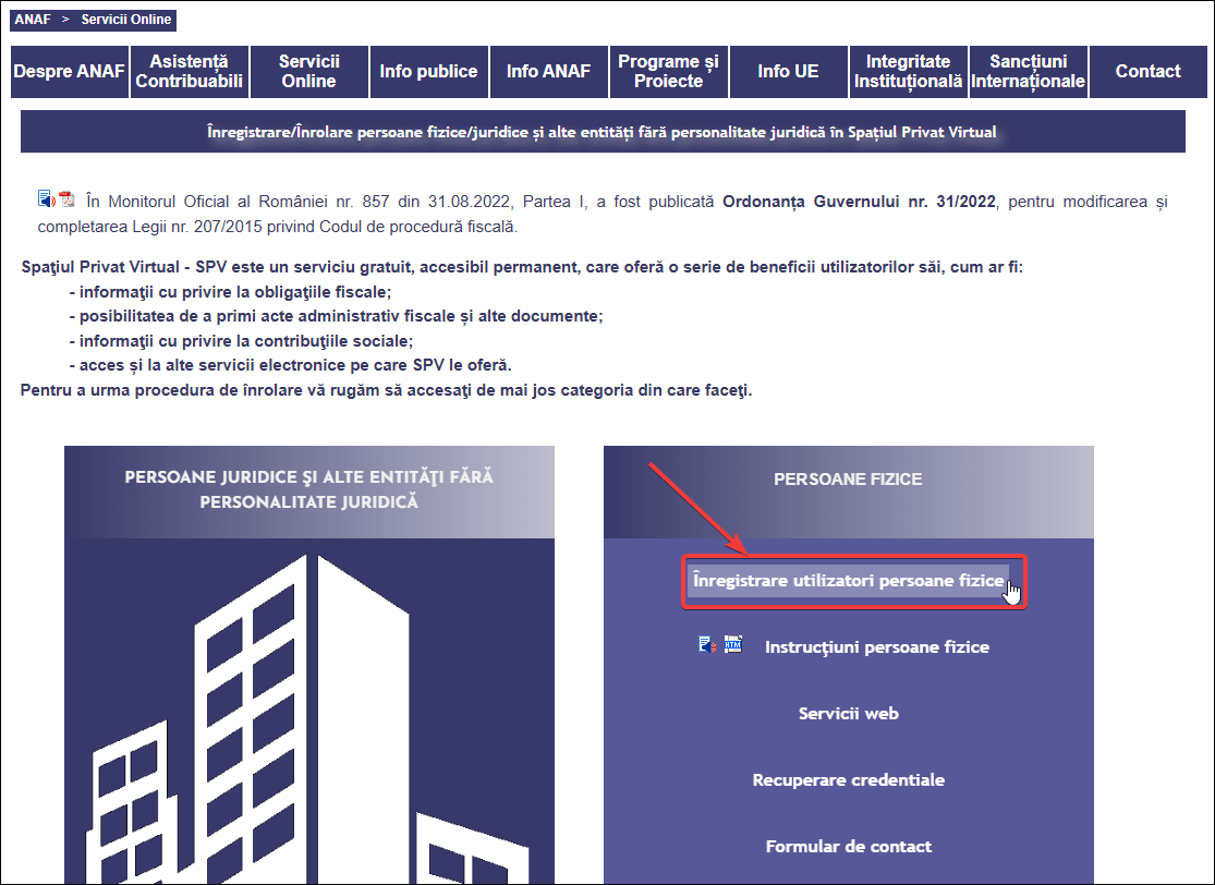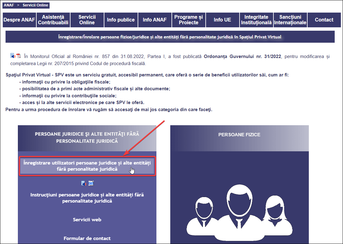 - În noua pagină care se deschide, alege Persoane Fizice → Înregistrare utilizatori persoane fizice.