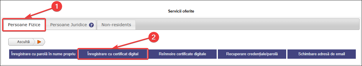 - Îți va apărea un nou meniu cu 3 variante: Persoane Fizice, Persoane Juridice și Non-residents. Asigură-te că meniul ales este Persoane Fizice și apoi apasă pe Înregistrare cu certificat digital.