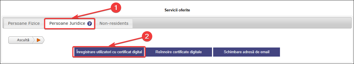 - Îți va apărea un nou meniu cu 3 variante: Persoane Fizice, Persoane Juridice și Non-residents. Asigură-te că meniul ales este Persoane Juridice și apoi apasă pe Înregistrare utilizatori cu certificat digital.