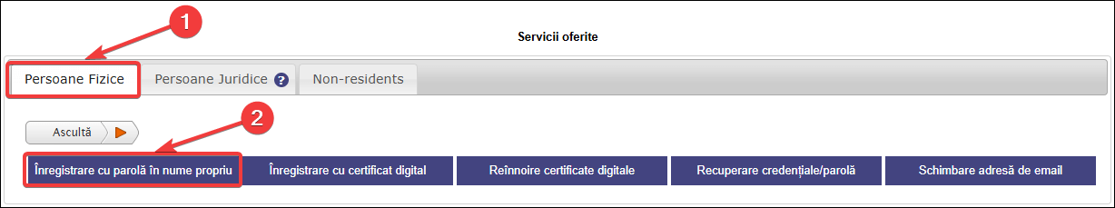 - Îți va apărea un nou meniu cu 3 variante: Persoane Fizice, Persoane Juridice și Non-residents. Asigură-te că meniul ales este Persoane Fizice și apoi apasă pe Înregistrare cu parolă în nume propriu.