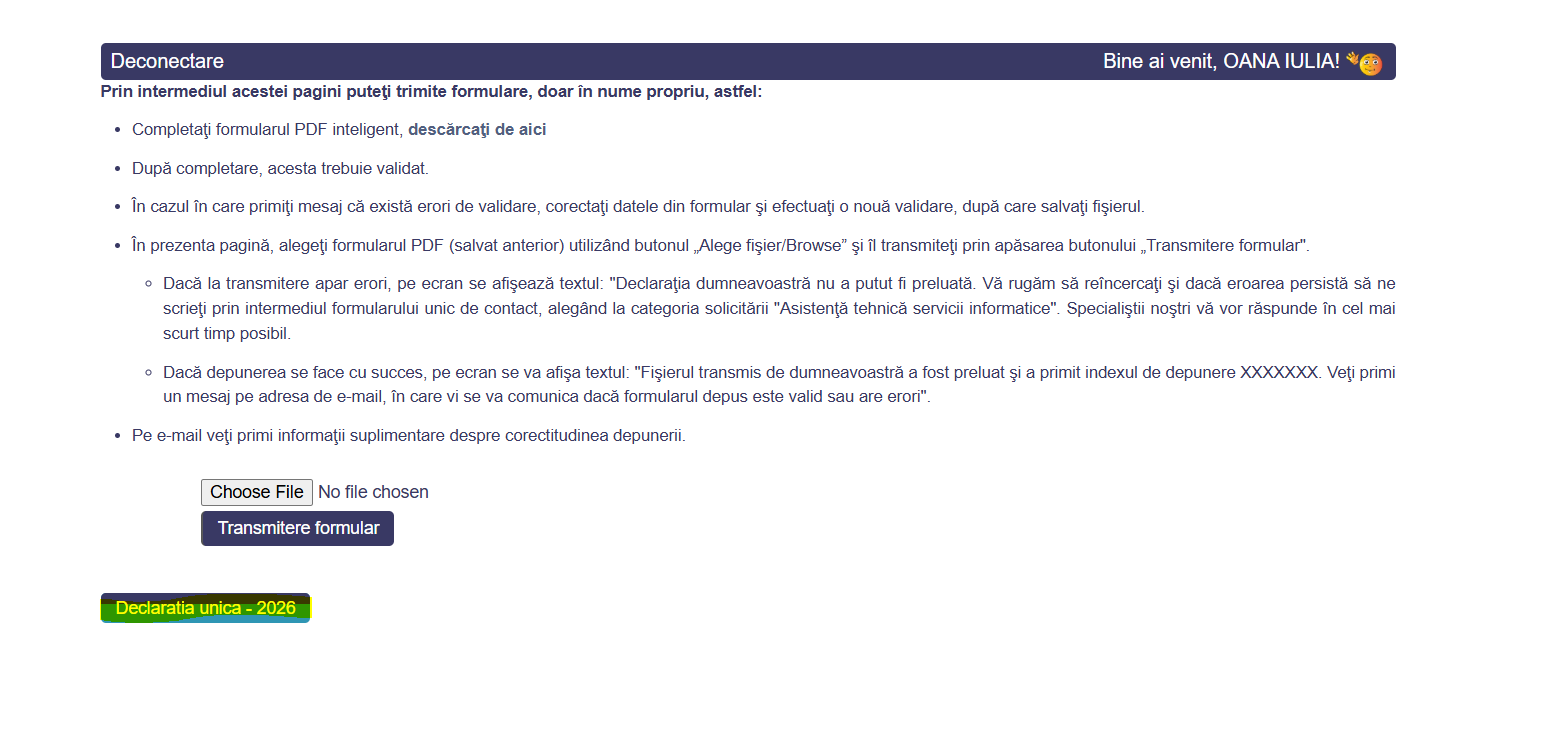 📌 De reținut: poți urma pașii și descărca Declarația unică precompletată doar dacă ai cont SPV cu user și parolă. În schimb, dacă ai cont SPV cu semnătură electronică, deocamdată nu vei putea vedea și descărca formularul.